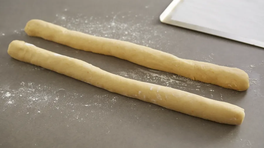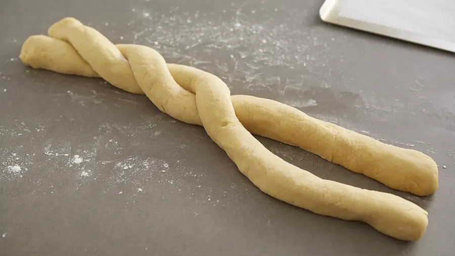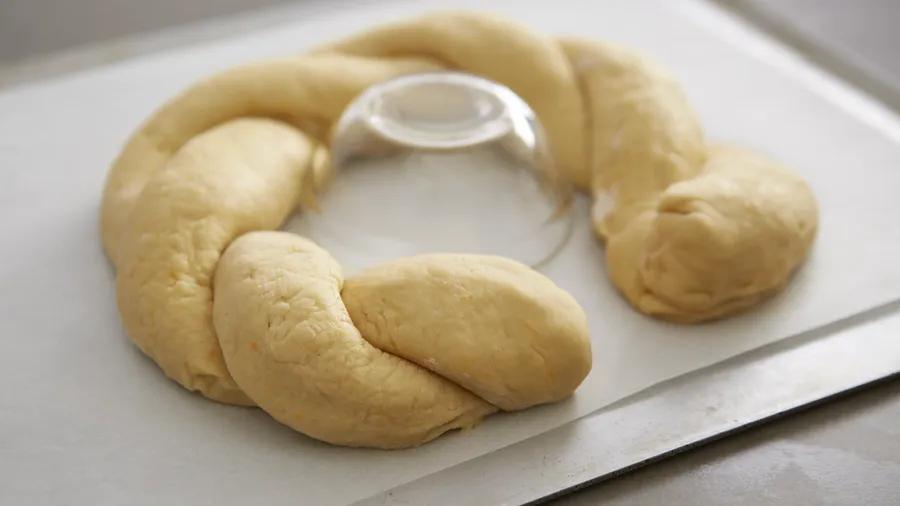 The next day, remove the dough from the refrigerator and lightly knead on a floured counter. Cut into 2 equally-sized portions and form equal-length pieces, about 22-24 inches. Twist them together to form a ring. Place an oiled glass in the center, to keep edges from coming together as it grows. Let the ring double its size in a warm place for at least 2 hours.