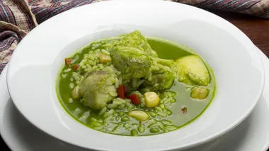 • In Peru, aguadito is the soup version of the famous arroz con pollo. Cooked in almost the exact same way, but with the addition of potatoes and chicken stock, this dish is a famous invigorator. In fact, it’s always served at the end of big parties before everyone goes home in the early hours of the morning. Aguadito is said to “levantar muertos," or awaken the dead. If the traditional aguadito made with white rice and potatoes is energizing, imagine the potential of this version! To make it even more powerful, I've used quinoa in all three colors (red, black and white) instead of rice, some nourishing sweet potato slices in place of regular potatoes and substituted chicken for delicious salmon. This recipe is your body's dream come true in a bowl.
