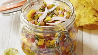 For the sauce: Mix mango, tomato, jalapeño, onion, cilantro, lemon juice and season with salt. Reserve in the fridge.