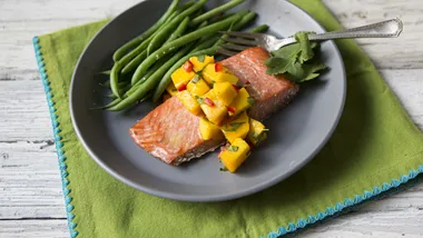 Put a layer of spinach on one of the buns, place the salmon on top, put some salsa on and close with the other bun.