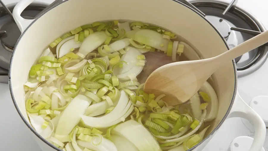 Clean chicken and remove skin. Boil chicken in water with onion, garlic, sofrito, leek, salt and pepper.