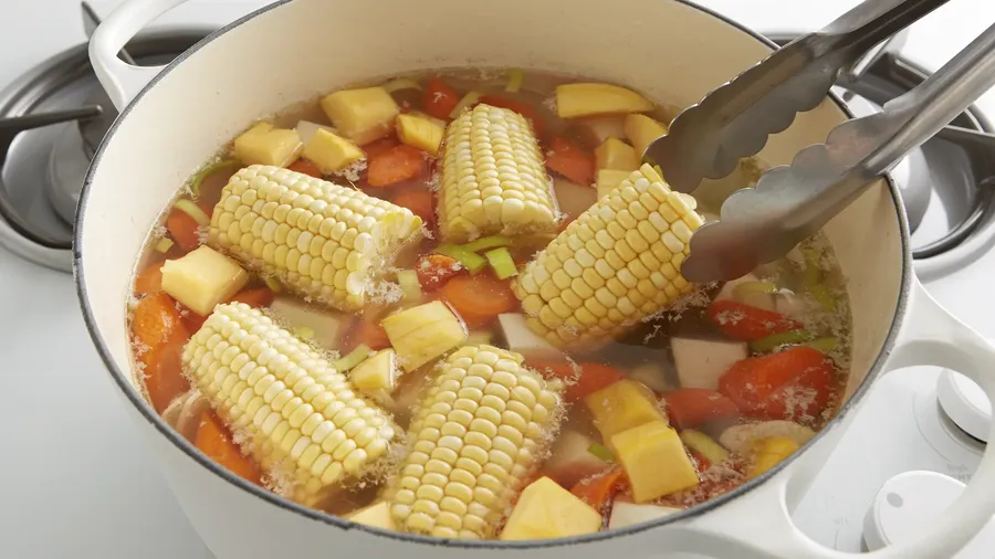 When tender, remove chicken; place whole or large vegetables pieces and corn on the cob in pot.