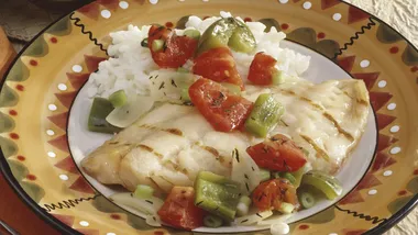 Steaming or broiling fish is recommended in order to cut down the amount of fats in our meals. This time I made it in a frying pan with a little bit of oil and some sautéed vegetables. This way all the flavors come together and the result is sabroso. I like to serve it over a bed of white rice or potatoes. Try it!