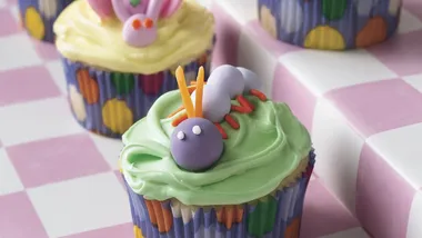 Heat oven to 350°F. Place paper baking cup in each of 24 regular-size muffin cups. Make and bake cake as directed on box for cupcakes. Cool completely and frost.