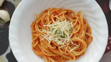 Serve the pasta hot and sprinkle with the slices of fried garlic and parmesan cheese. Add ground pepper if you like. Garnish with parsley.