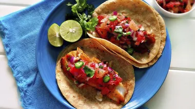 Add 2-3 tilapia strips and 4-5 shrimps to each tortilla. Top with mango salsa and lemon juice.