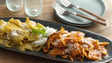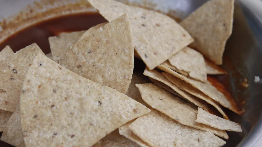 Add tortilla chips to the sauce and stir until completely covered. Cover and let cook another minute.