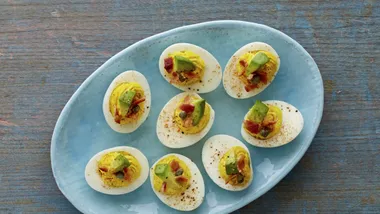 You can make these deviled eggs ahead, but garnish with cocktail sauce and green onions just before serving.