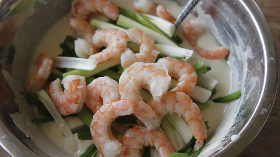 Combine the chopped onions and whole shrimp with the flour and water mixture. Stir well.