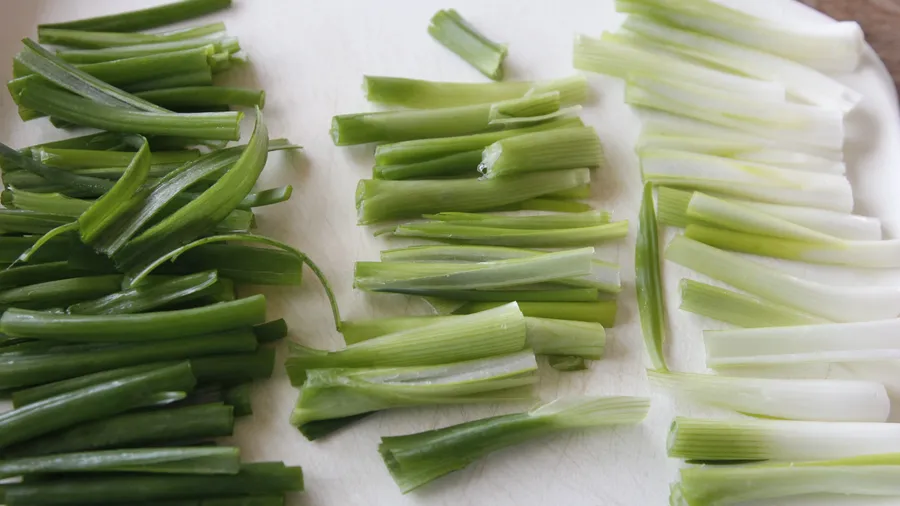 Cut the ends of the onions. Slice them in half lengthwise and then 3 inches in length.