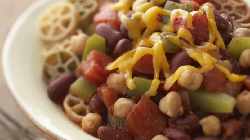 To serve, cook pasta according to package directions; drain. Serve bean mixture over hot cooked pasta. Sprinkle with cheese.