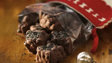 Evenly distribute the mixture and press it down into the pan with fingers coated in cooking spray, a piece of waxed paper, or a spatula. Garnish with snowflake sprinkles and refrigerate until firm.