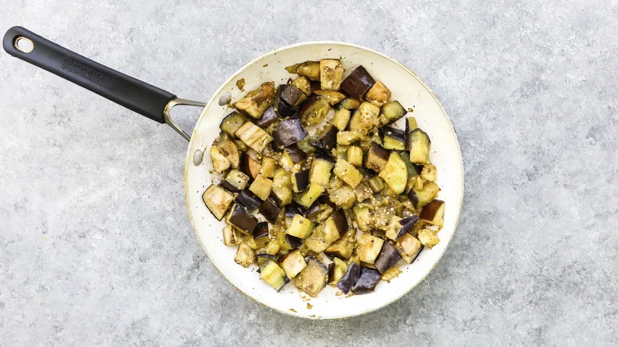 In a big pan warm up 2 tablespoons olive oil. Add the eggplant and water. Season to taste and cook until the eggplants are soft, for about 5 – 8 minutes.