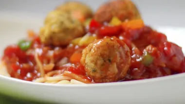 Place the hot eggplant meatballs over the cooked spaghetti and garnish with parmesan cheese and basil. Serve.