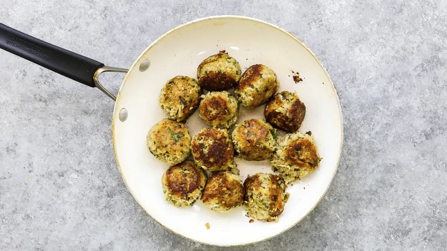 Add the remaining 2 tablespoons olive oil in the same pan and heat over medium heat. Form little balls using the eggplant mixture, and place them over the hot oil. Cook until they’re golden brown on all sides, for about 5 minutes.