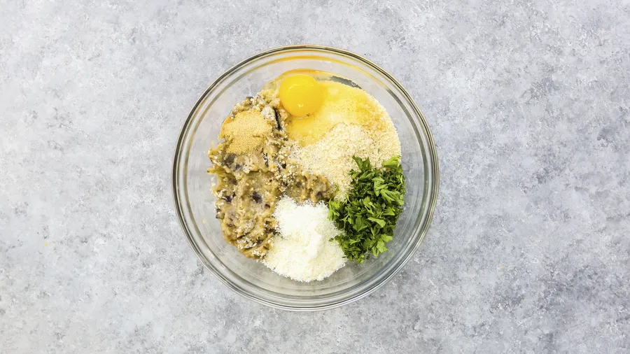 Transfer the eggplant puree, breadcrumbs, eggs, parmesan cheese, garlic and parsley in a medium-sized bowl and mix until everything is well combined.