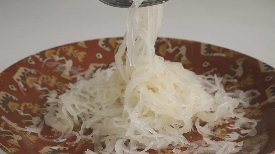 Take the squash out of the fridge, turn it around and remove the seeds if you haven’t done so. Cut it in half with a knife and remove the strands using forks. The fiber should come out as if it were spaghetti.