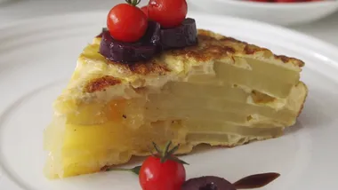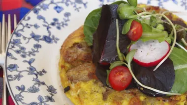 For the oven baked omelet: Heat the 2 remaining tablespoons of olive oil in cast iron or oven safe skillet over medium high heat. Add onions and tomatoes and sauté for 4 minutes. Add fresh spinach and continue to sauté until wilted. Season with salt and pepper, add roasted butternut squash and stir to combine. Stir in whisked eggs, reduce heat to simmer and cook undisturbed for 2 minutes or until bottom is set. Transfer the pan to the oven and cook for 15-20 minutes or until eggs are set. Remove from oven, allow to cool for 5 minutes, run knife around edges to loosen. Slice and serve warm garnished with additional sage leaves.