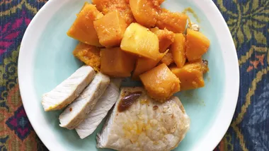 • I present to you a hearty breakfast or brunch omelet with the flavors of fall: roasted butternut squash with sage, sautéed onion, tomatoes and spinach swirled into a bed of fluffy eggs.
