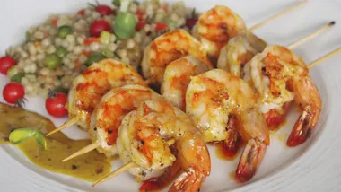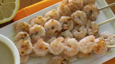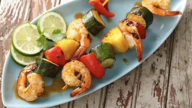 Place kabobs on grill over medium heat. Cover grill; cook 4 to 6 minutes or until shrimp are pink. Serve with coconut-curry sauce.