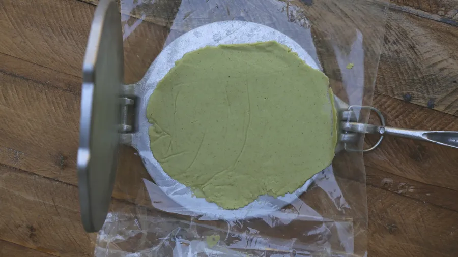 Place one at a time onto a tortilla press lined with plastic film or plastic bag, press firmly.