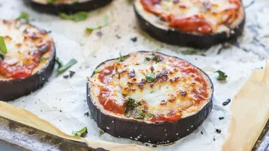 You may dehydrate and bake the eggplant ahead of time. Let cool and store in an airtight container in the refrigerator. With this step behind you, it will only take a few minutes to prepare the dressing and serve the stack salads.