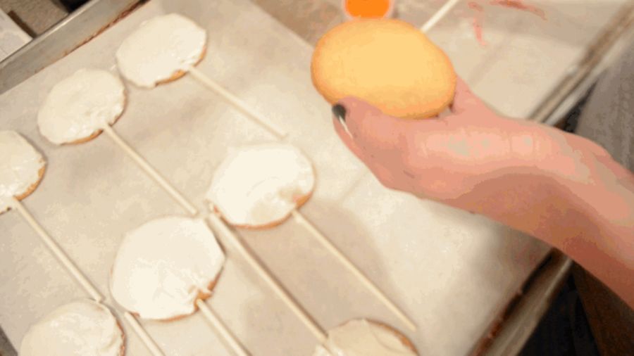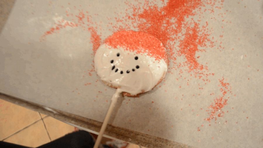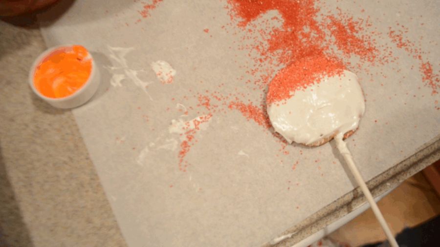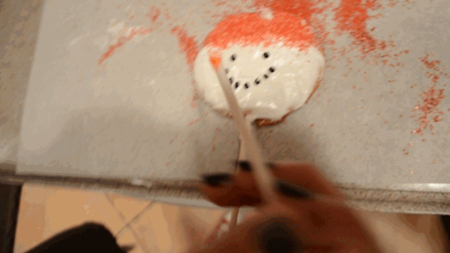 Add a few drops of orange food coloring to a small cup of white frosting to make his carrot nose. Apply the nose with a cake pop stick.