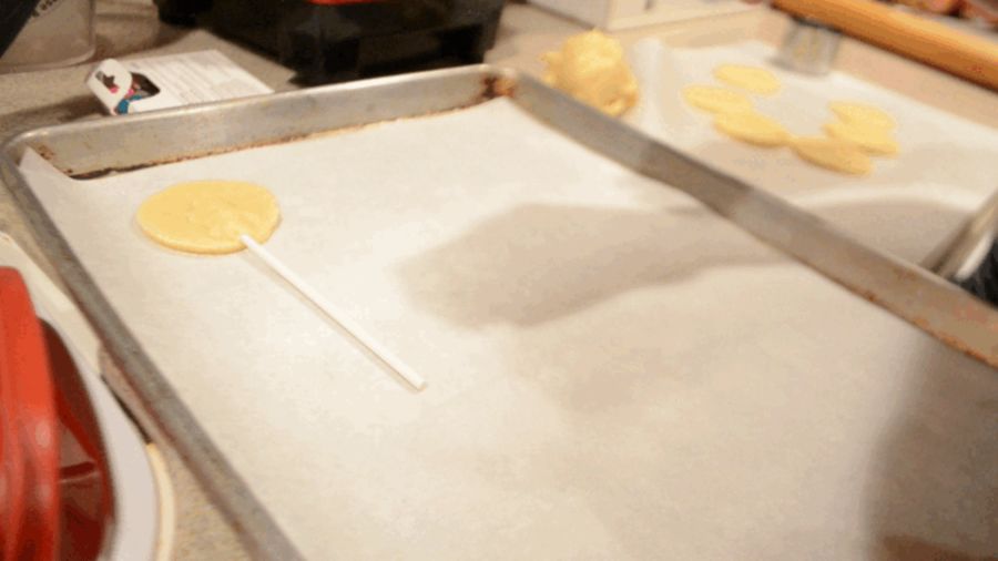 Line your baking sheet with wax paper and place your snowman circles on the sheet. Place your stick in the middle of each circle, and cover it with a pinch of dough.