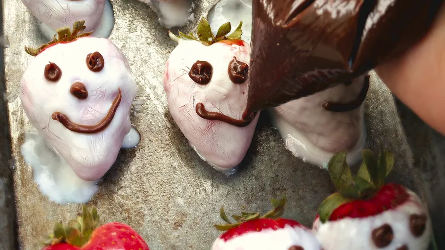 Pour the chocolate frosting into a plastic sandwich bag. Make a small cut into a corner of the bag. Take the strawberries out of the freezer and decorate them as skulls with the chocolate frosting.