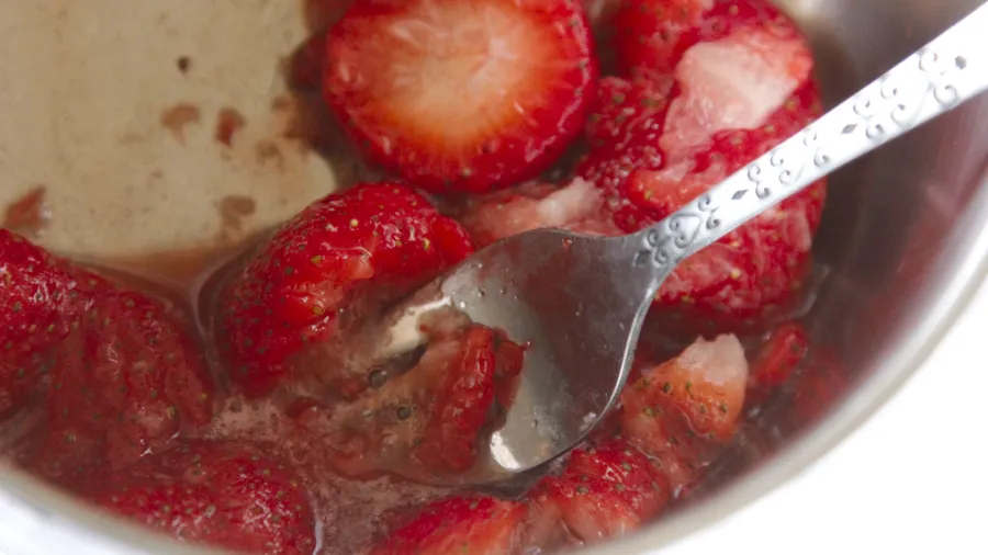 Put the strawberries and half the sugar in a pot over high heat. As it gets warm, crush the strawberries with a fork so the juice comes out quickly.