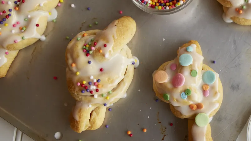 Taking doughnuts as their inspiration, these glazed and sprinkled crescent knots look as pretty as a bakery shop window. But wait until you bite in, where cream cheese and strawberries await you.