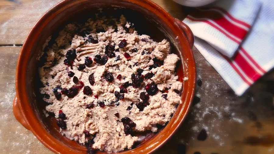 Whip the butter and sugar with a mixer on medium speed for 2 to 3 minutes until it’s soft and fluffy. Add the harina masa mix, whipping until it’s completely mixed and has a sandy texture. Add the strawberries and keep whipping for a minute. Add the dried blueberries and cover them with the mix. Add a few drops of pink or red food dye if you want a more intense color.