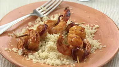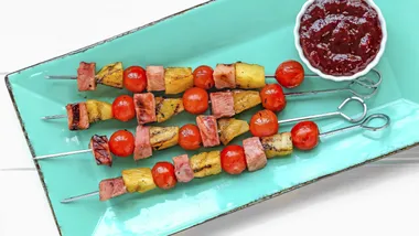 Apricot preserves add a sweet note to these fun, grilled pork and veggie kabobs.
