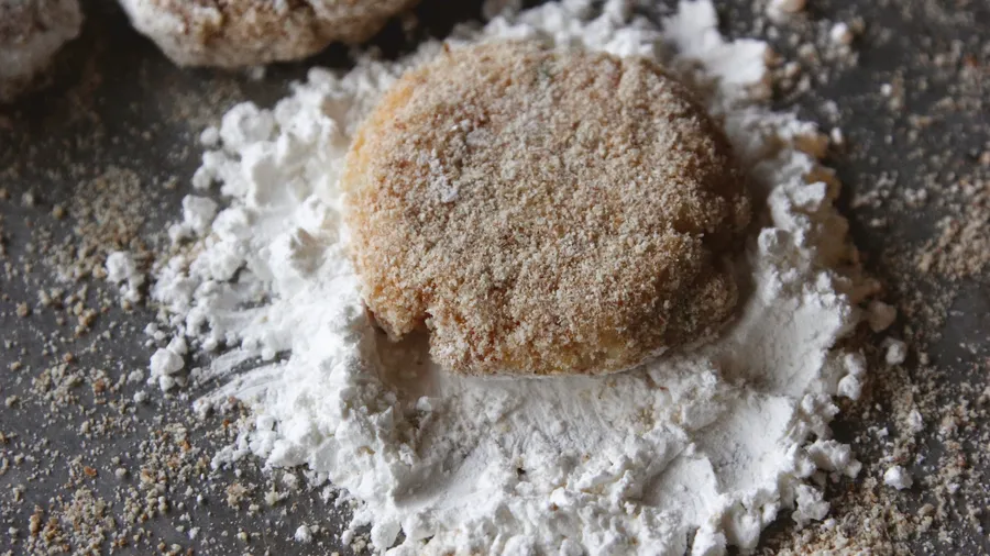 Put the cornstarch in a deep bowl. Take a cake and cover it with a light layer of cornstarch. Then, cover it with breadcrumbs again and put it back on the tray. Repeat until you’ve done this with all the cakes. Place the tray back in the freezer while the oil gets hot.