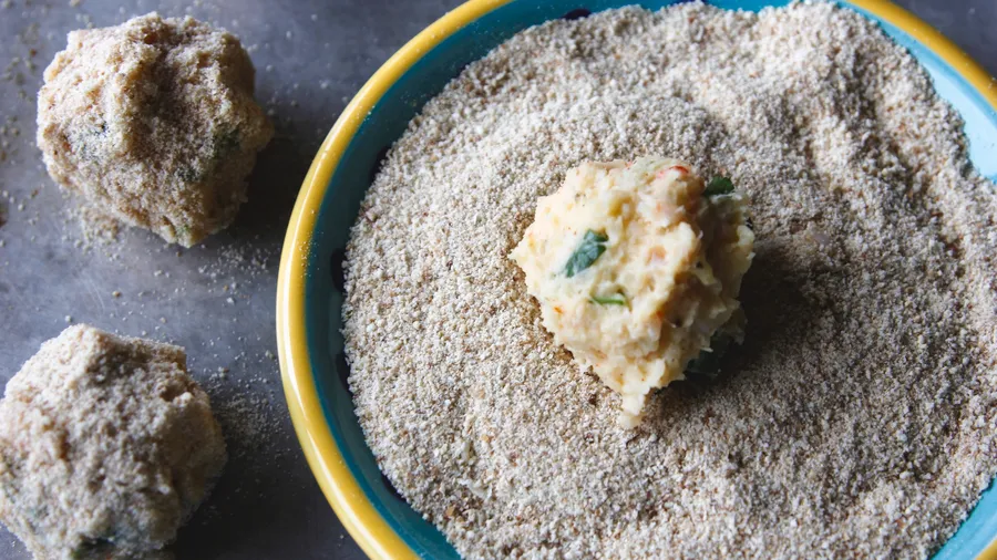 Make 12 round cakes. Pour the breadcrumbs into a serving plate. Take a cake and cover it with bread. Place it on a tray (one that you can fit in the freezer). Repeat until you’ve done them all. Cover them with plastic and put them in the freezer for 20 minutes.