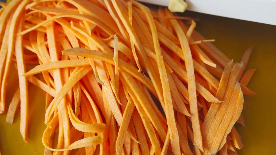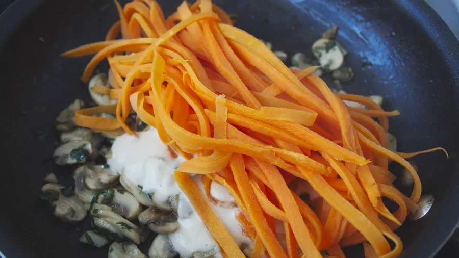 I love making sweet potato noodles because sweet potatoes are a wonderful ingredient, and I can enjoy this delicious vegan lunch. You won’t really miss the cream or cheese, but if you like them, don’t be afraid to add them in too! My daughter says I should prepare this lunch often because it helps me stay young. I cut the sweet potatoes with a mandolin slicer, but you can also use a potato peeler. You might not get the beautiful slices, but they’ll be perfect.