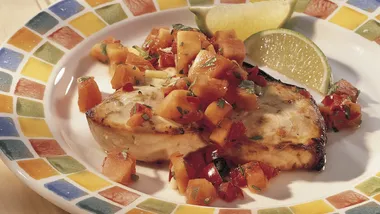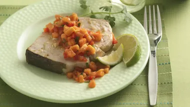 Place fish on grill over medium heat. Cover grill; cook 8 to 12 minutes, turning once, until fish flakes easily with fork. Serve fish with salsa.
