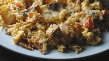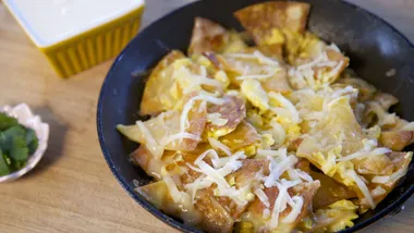 Pour the eggs over the vegetables and stir. When the eggs begin to cook and are two-thirds of the way ready, add the tortilla chips and cheese. Stir until the eggs have completely cooked but are still soft and the cheese has melted.