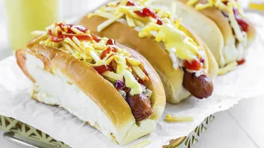 Serve the hot dogs in hot dog buns. Add the ketchup, mustard and sauce. Chop the remaining onion and add 1 tablespoon to each hot dog as a final garnish.