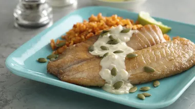 In another bowl, combine the yellow chili pepper sauce, lime juice, garlic, ginger and salt. Stir well and add a few ice cubes or a tablespoonful of cold water. Pour the finished sauce over the fish.