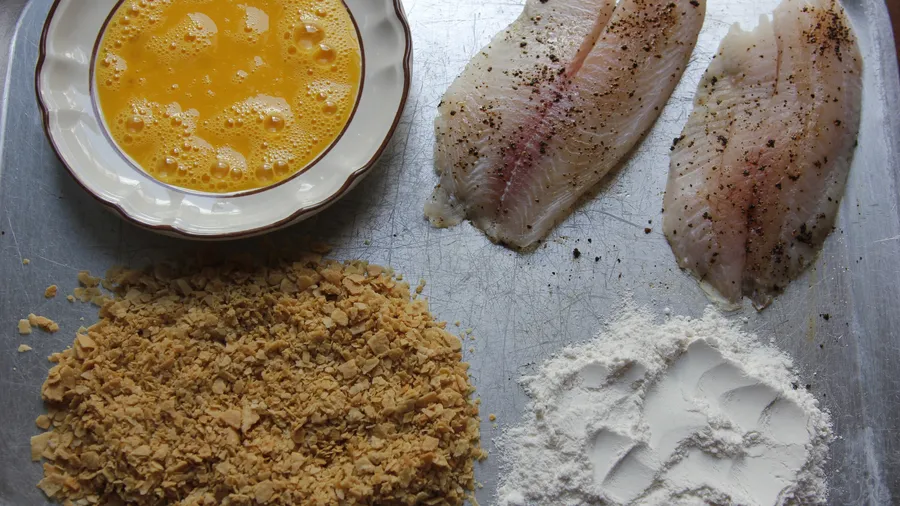 Take one of the filets and coat them with flour. Then, dip them in the egg and coat them with the crushed totopos. Repeat.