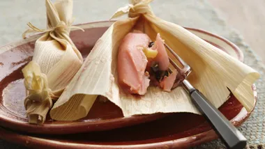 Chicken and Progresso® broth come together in these tomatillo salsa tamales that are wrapped in banana leaves - a perfect Mexican dinner.