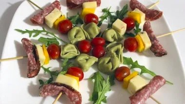 Drain tortellini mixture. On each skewer, thread tortellini, mushrooms and tomatoes alternately. (For rosemary sprigs, use your fingers to remove all but the top leaves; thread ingredients from the bottom.) Serve on bed of lettuce leaves.