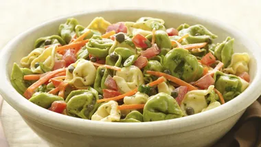 Cook and drain tortellini as directed on package. Cool 15 minutes.