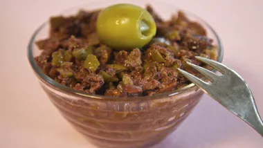 For more texture and flavor, add one thinly sliced red pepper with the onions and black olives before mixing the potatoes with the egg.