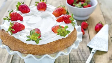 • Treat your guests with this delicious tres leches cake layered with whipped topping and garnished with strawberries - a wonderful dessert.