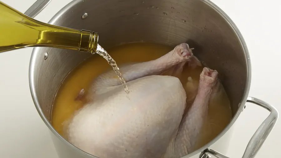 In a large stock pot (big enough to hold a turkey), place the turkey, orange juice and wine. Soak cheesecloth in liquid then cover the top of the turkey with the damp cloth.