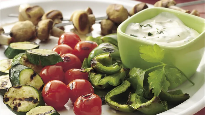 Place skewers of bell pepper and zucchini on grill over medium heat. Cover grill; cook 2 minutes. Add skewers of mushrooms and tomatoes. Cover grill; cook 4 to 5 minutes, carefully turning every 2 minutes, until vegetables are tender. Remove vegetables from skewers to serving plate. Serve with dip.