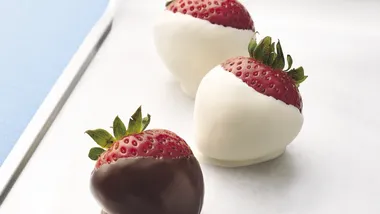 Dip the berries in the melted semisweet chocolate and drizzle with the melted white baking chips.