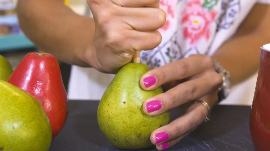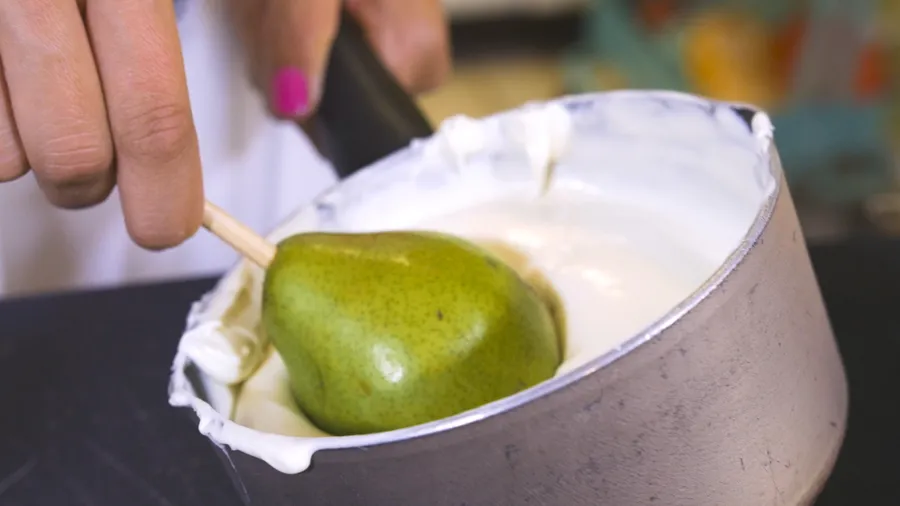Remove the stem from the pears and insert a wooden stick in its place or at the center of each pear.